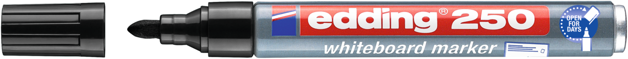 Whiteboardmarker zum Schreiben und Markieren auf Whiteboards, auch für Flipcharts geeignet. Trocken abwischbar von fast allen geschlossenen Oberflächen wie z.B. Emaille und Melamin. Die Rundspitze hat eine Strichbreite von 1,5-3 mm. Dank "cap off" Technologie kann das Produkt bis zu einigen Tagen offen liegen bleiben, ohne auszutrocknen (Prüfklima nach ISO 554). Die Tinte des Whiteboardmarkers ist lichtbeständig und schnelltrocknend. Erhältlich in 10 verschiedenen Farben. Nachfüllbar in den Farben schwarz, rot, blau und grün. Ersatzspitzen sind erhältlich. Ohne Zusatz von Butylacetat. Hochwertiger Aluminiumschaft.