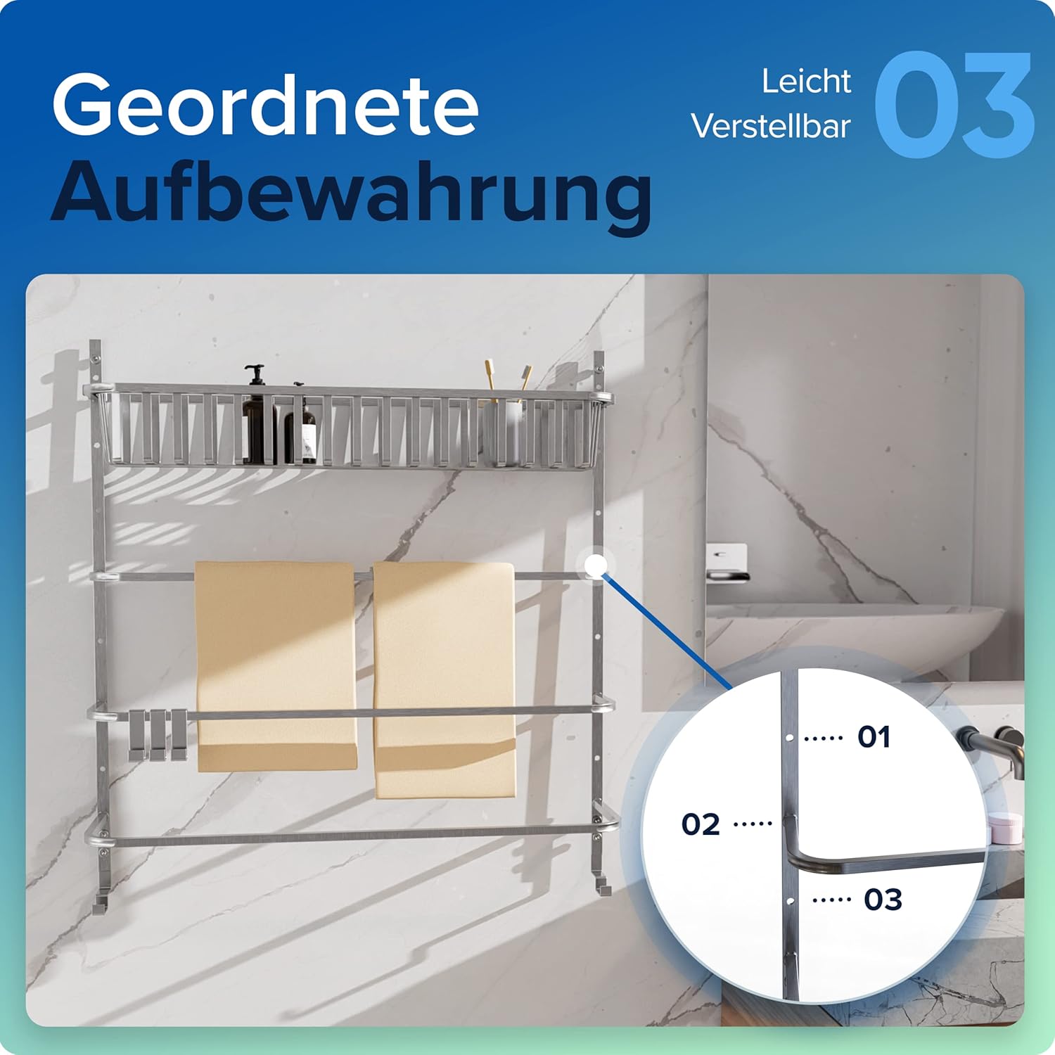 • Drei Handtuchstangen für geordnetes Aufhängen und schnelles Trocknen.
