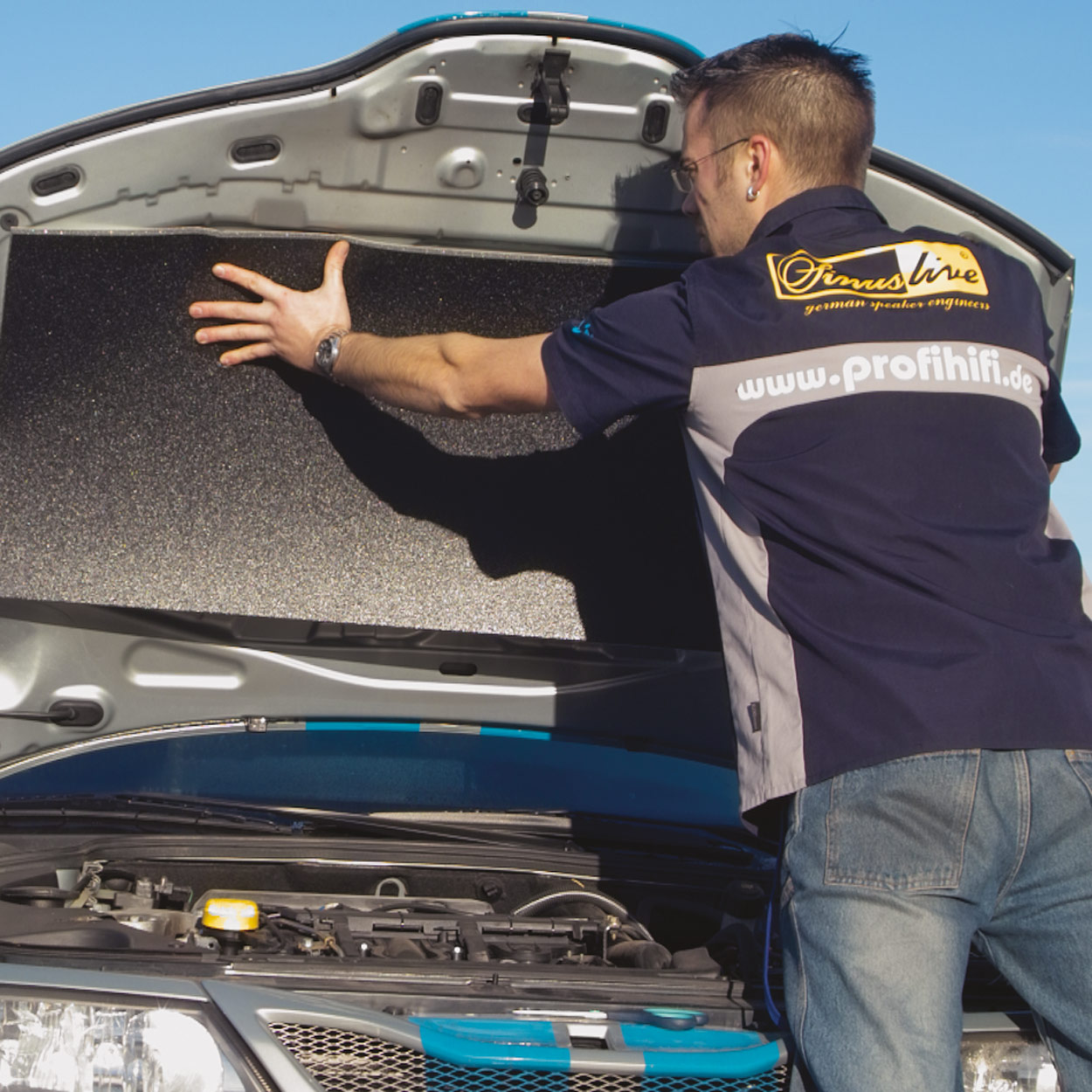 Dämmschaummatte mit selbstklebender Rückseite. Geeignet für alle Kfz-Motorhauben und viele andere Dämmanwendungen wie z.B. für PC-Gehäuse. Der Matte wird direkt aufgeklebt und dämmt schwingende Bleche und andere schwingende und klappernde Flächen.