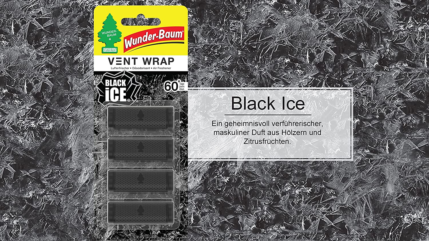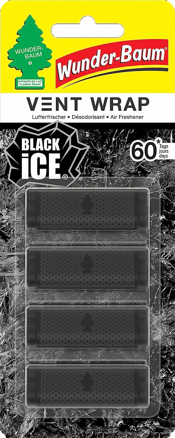 Wunder-Baum Vent Wrap Black Ice Unsichtbarer Lufterfrischer Parfümierer Superlang anhaltender Duft für Auto, Haus, Büro, etc. Fantastischer unsichtbarer Lufterfrischer in Clipform. Eine geheimnisvolle und verführerische, maskuline Mischung aus Zitrusfrüchten und Hölzern. Der Duft von Black Ice hält viel länger an. Bis zu 60 Tage lang, dank der 4 austauschbaren Clips. Ideal für das Auto, zu Hause, im Büro oder überall. Clip-on-Parfümspender zur Befestigung an den Lüftungsdüsen im Auto.