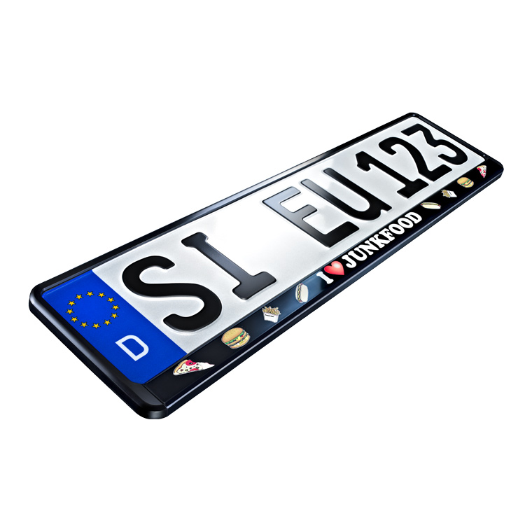 "I love Junkfood" - gib der Welt mit diesem Kennzeichenrahmen Dein ganz persönliches Statement ab! Der brillante Digitaldruck widersteht Wetter- und Witterungseinflüssen und ist natürlich waschstraßenfest.