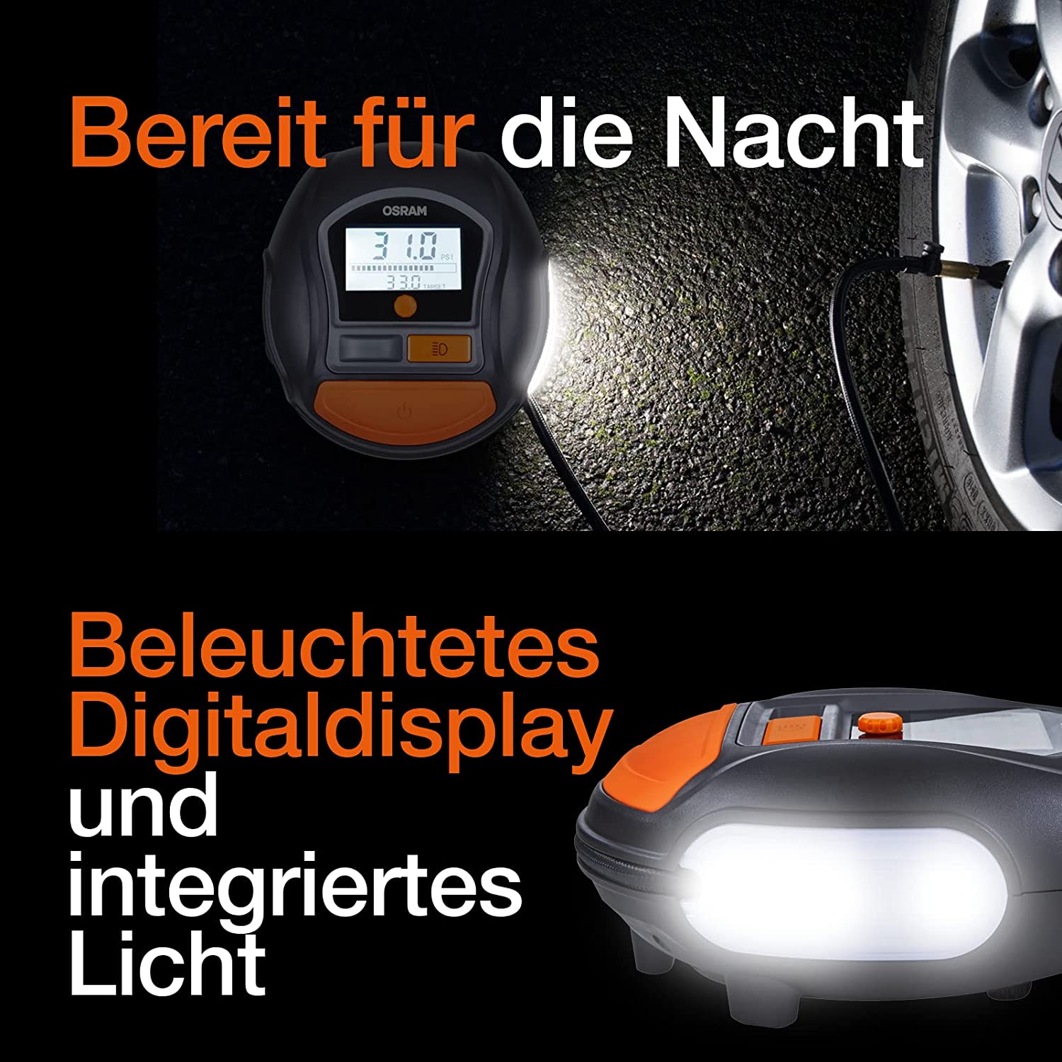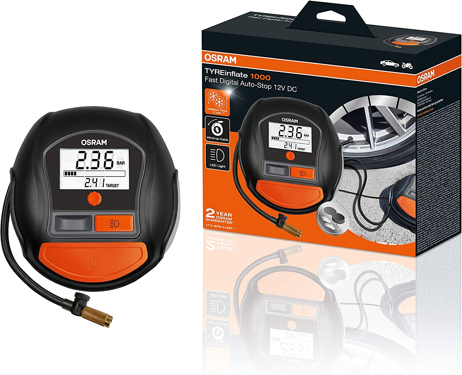 Der OSRAM Tyreinflate 1000 ist eine schnelle, effektive und effiziente digitale Reifenpumpe mit einer beleuchteten Digitalanzeige für einfache und genaue Druckmessungen. Ausgestattet mit einer Auto-Stopp-Funktion, um den gewünschten Druck einzustellen, der zum Aufpumpen Ihrer Reifen erforderlich ist. Die automatische Einstellung des Tyreinflate 1000 ist unglaublich einfach einzurichten. Stellen Sie einfach mit dem Drehknopf den gewünschten Druck ein, klicken Sie zum Einstellen und drücken Sie dann Start. Der Tyreinflate 1000 stoppt automatisch, sobald der richtige Druck erreicht wurde.