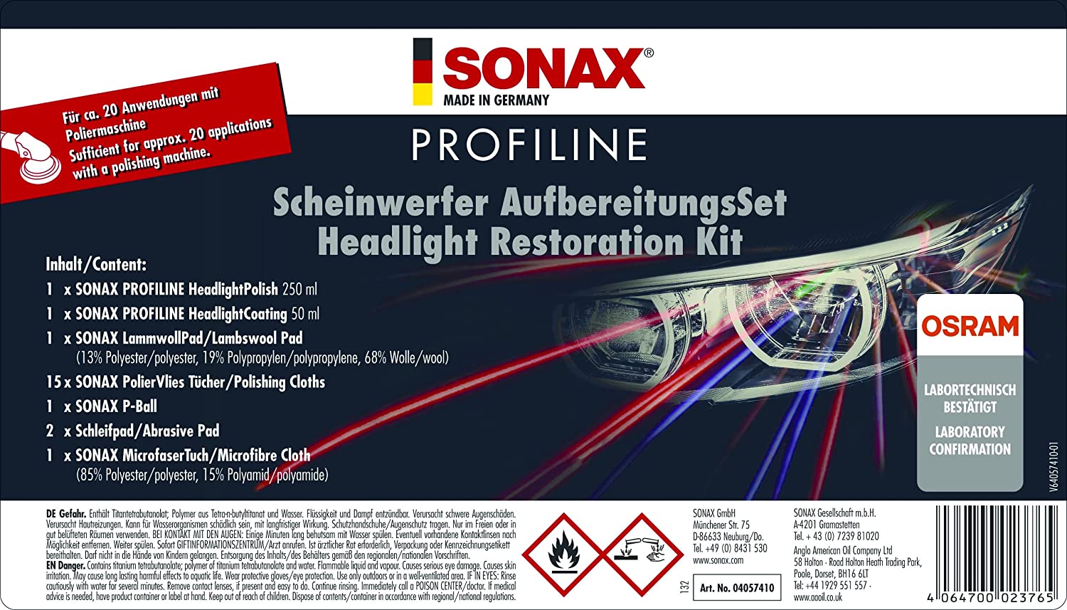 Set zur professionellen Aufbereitung von altersbedingt vergilbten und vermatteten Scheinwerfer-Abdeckungen aus Kunststoff.Die Anwendung bringt die ursprüngliche Klarheit der Scheinwerfer zurück und sorgt für eine deutlich verbesserte Lichtausbeute und somit für mehr Fahrsicherheit.Ausreichend für ca. 20 Anwendungen.