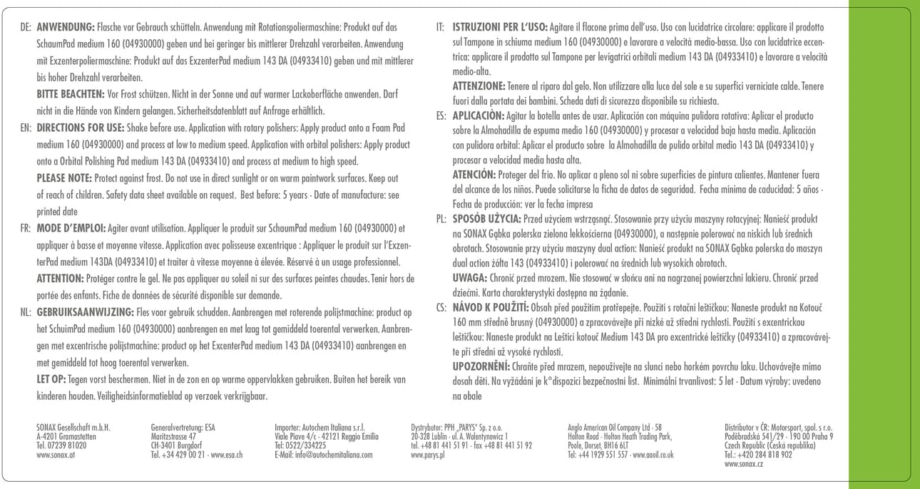 Milde All-in-one-Politur mit Schnellversiegelung für Hand- und Maschinenanwendung. Erzeugt intensive satte Farben für ein perfektes Showroom-Finish. Silikonhaltig. Entfernt leichte Kratzer, erzeugt hohen Glanz. Ergebnis ist 100% hologrammfrei. Macht den Lack extrem glatt, schmutz -und wasserabweisend.