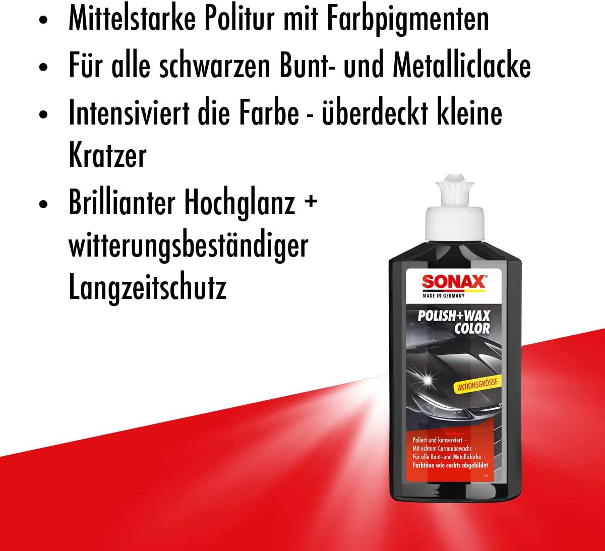 Mittelstarke Politur für neuwertige und leicht matte Lacke mit Farbpigmenten und Wachsanteilen. Glättet, poliert und konserviert alle Bunt- und Metalliclacke in einem Arbeitsgang. Kleine Kratzer und Lackbeschädigungen werden durch die Farbpigmente überdeckt und vor Korrosion geschützt. SONAX Polish+Wax Color verleiht dem Lack leuchtende Farbkraft, sorgt für brillanten Hochglanz und witterungsbeständigen Langzeitschutz durch echtes natürliches Carnaubawachs.