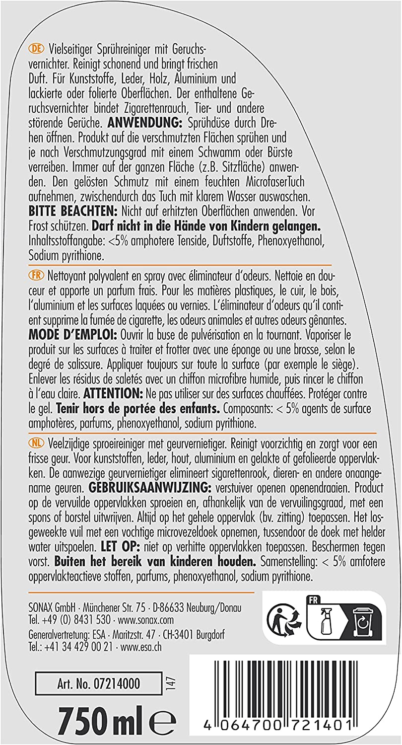 Vielseitiger Sprühreiniger mit Geruchsvernichter. Reinigt schonend und bringt frischen Duft. Für Kunststoffe, Leder, Holz, Aluminium und lackierte oder folierte Oberflächen. Der enthaltene Geruchsvernichter bindet Zigarettenrauch, Tier- und andere störende Gerüche.