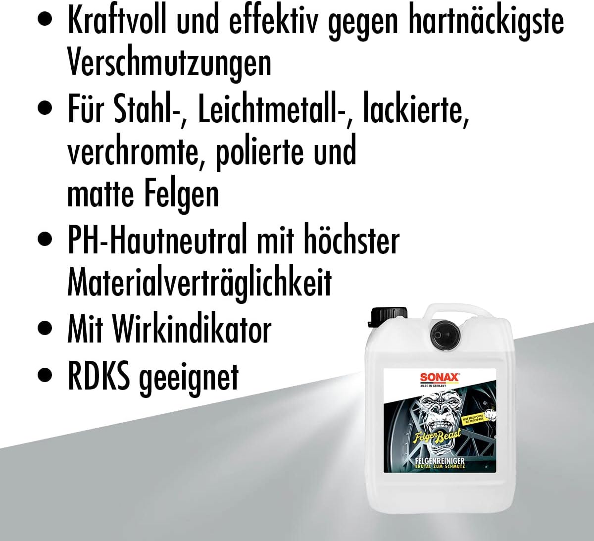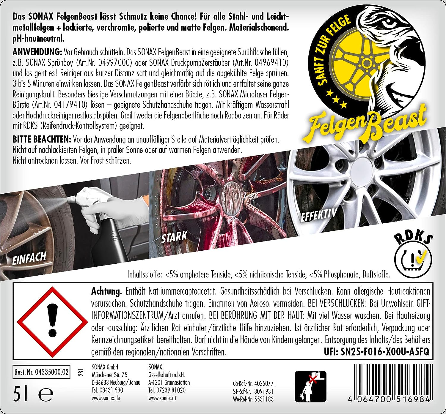 Das SONAX FelgenBeast lässt Schmutz keine Chance! Für alle Stahl- und Leichtmetallfelgen + lackierte, verchromte, polierte und matte Felgen. Entfernt selbst biestige Verschmutzungen. Das SONAX FelgenBeast verfärbt sich rötlich und entfaltet seine ganze Reinigungskraft. Besonders materialschonend, greift weder die Felgenoberfläche noch Radbolzen an. Für Räder mit RDKS (Reifendruck-Kontrollsystem) geeignet.