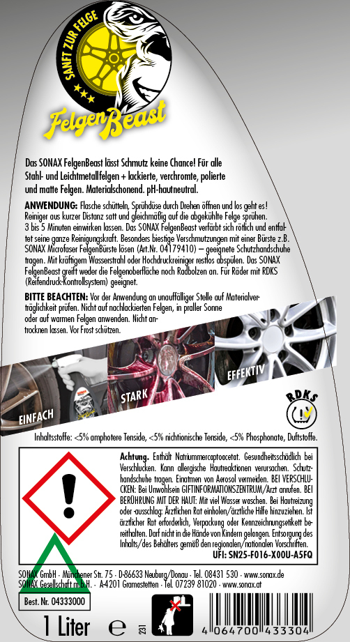 Das SONAX FelgenBeast lässt Schmutz keine Chance! Für alle Stahl- und Leichtmetallfelgen + lackierte, verchromte, polierte und matte Felgen. Entfernt selbst biestige Verschmutzungen. Das SONAX FelgenBeast verfärbt sich rötlich und entfaltet seine ganze Reinigungskraft. Besonders materialschonend, greift weder die Felgenoberfläche noch Radbolzen an. Für Räder mit RDKS (Reifendruck-Kontrollsystem) geeignet.