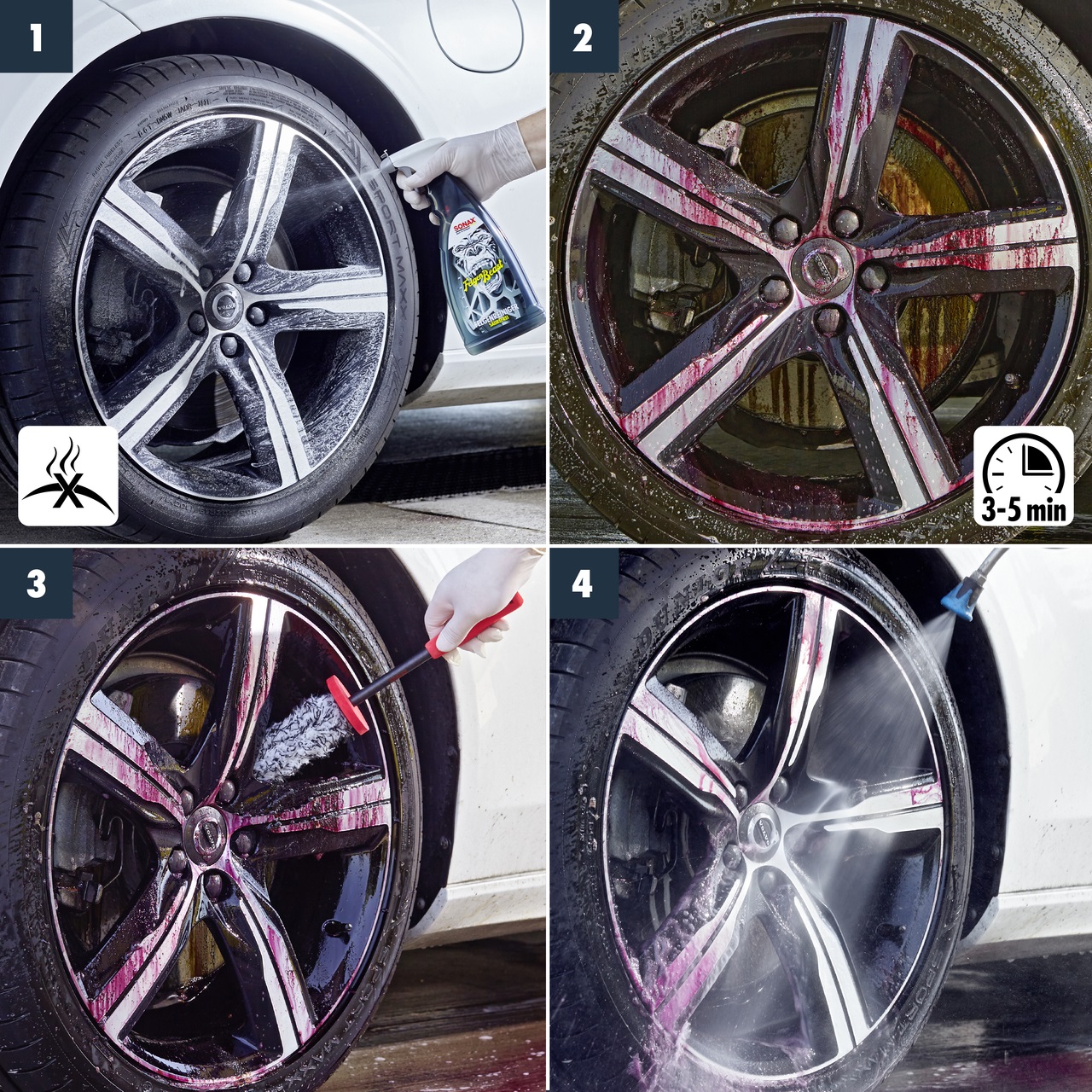 - Bei Kontakt mit Verschmutzungen verfärbt sich das SONAX FelgenBeast rötlich und entfaltet seine ganze Reinigungskraft