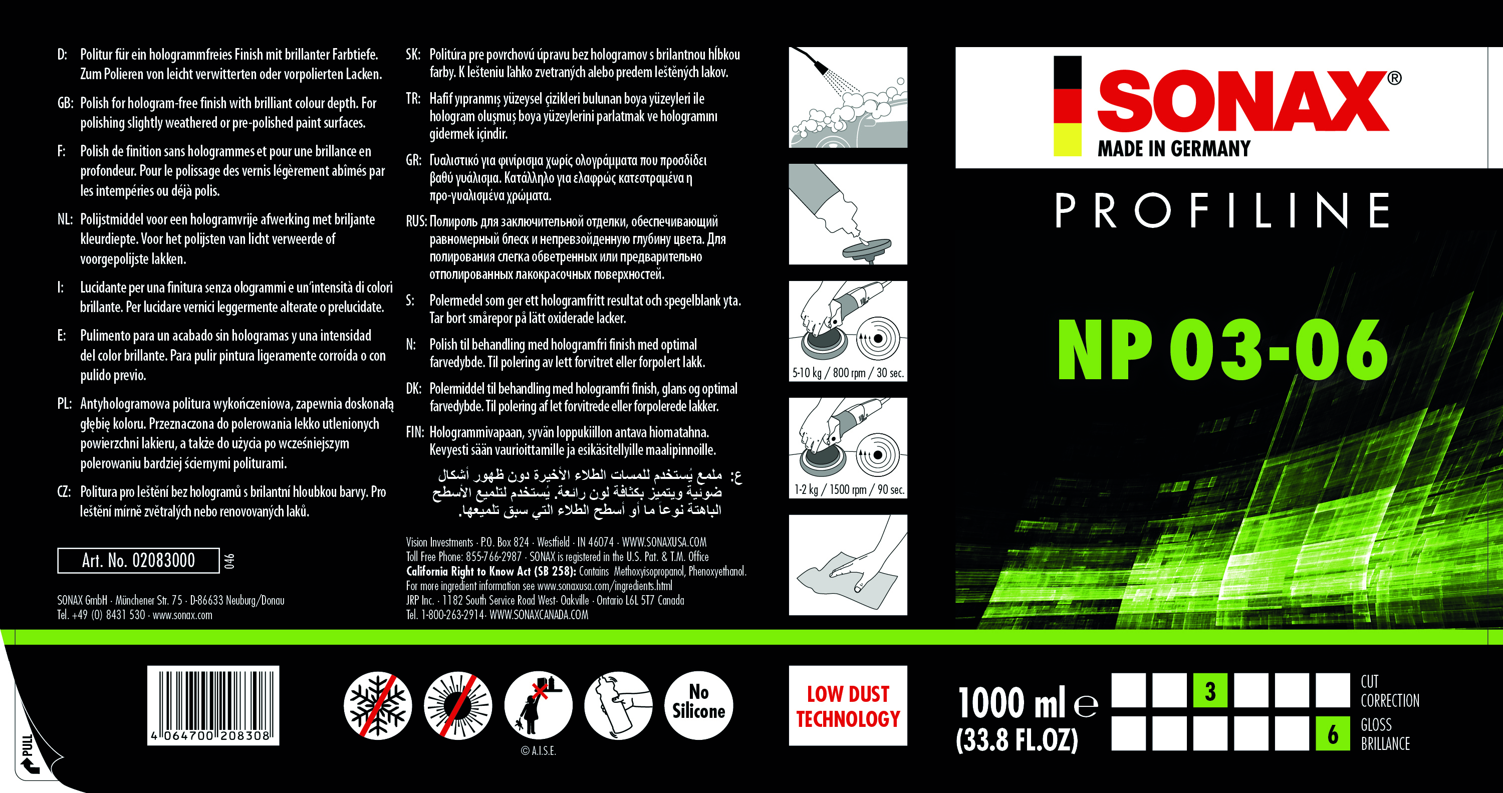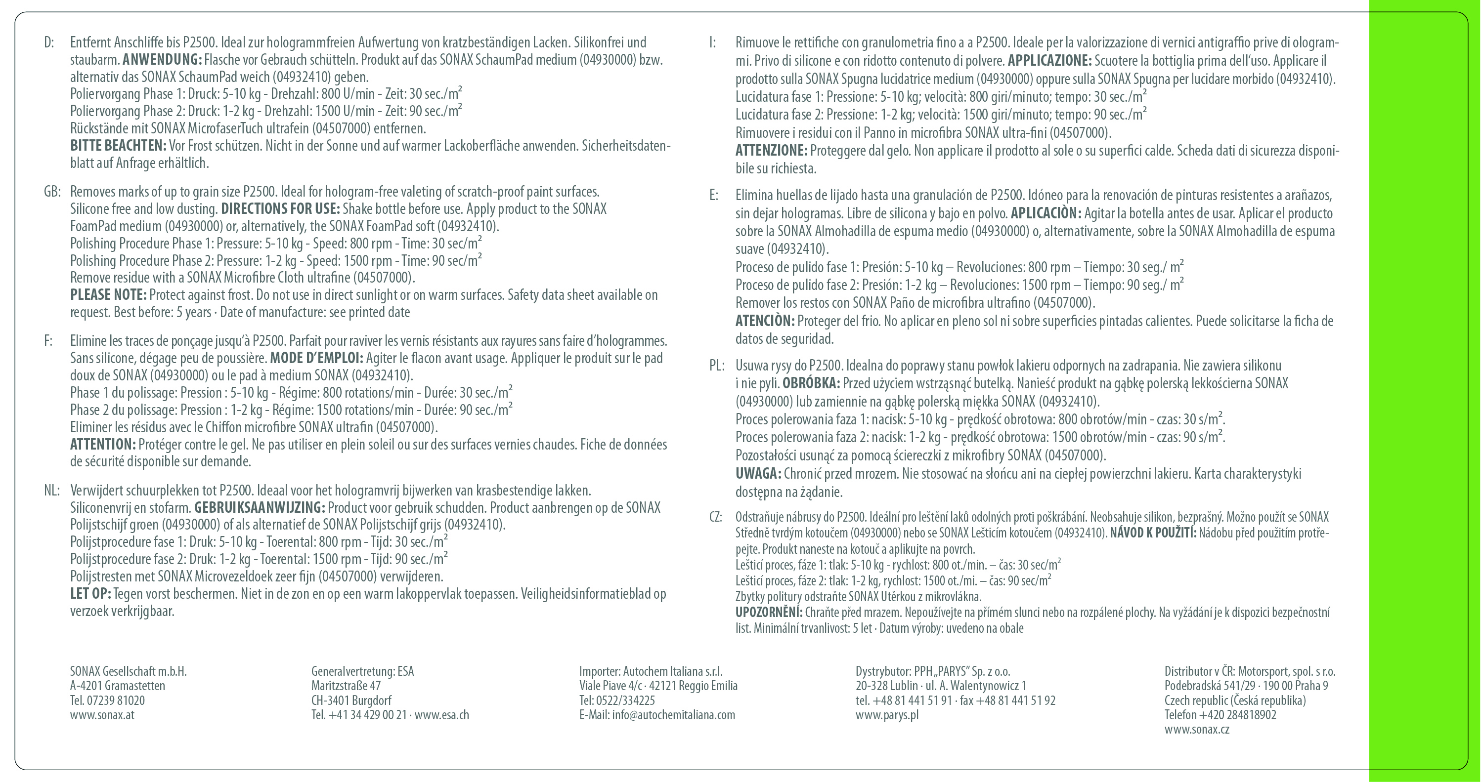 Silikonfreie Politur zum professionellen Polieren von matten und verkratzten Lacken, speziell von kratzbeständigen Klarlacken mit Poliermaschine. Ideal als Finishpolitur nach dem Vorpolieren mit Schleifpolituren. Die Verwendung eines neuartigen Nano-Schleifmittels ermöglicht ein zügiges Polieren mit guter Kratzerentfernung und sorgt gleichzeitig für hohen Glanz. Gibt bei sachgerechter Anwendung keine Hologramme oder Schwabbelhiebe auf dem Lack. Entfernt Schleifriefen von Schleifpapier P2500. Schleifleistung: 3 Glanz: 6
