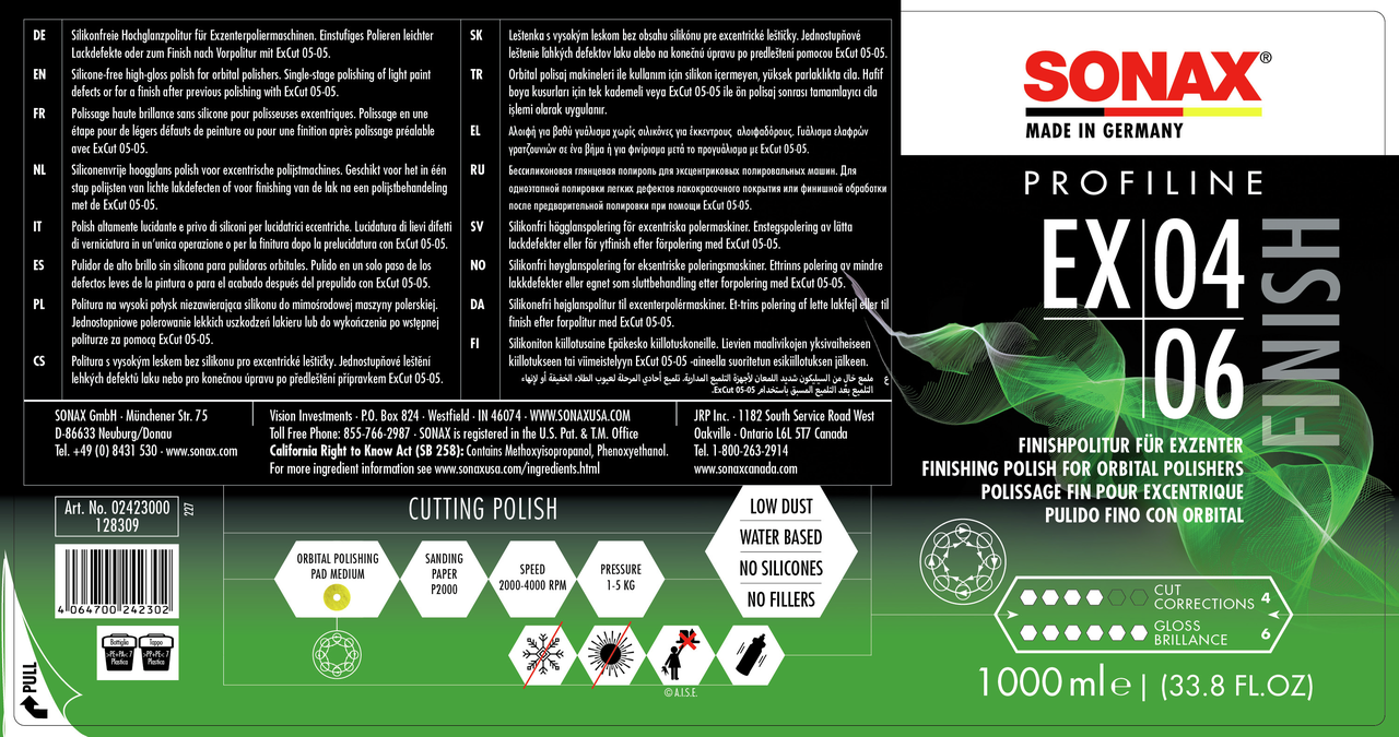 Spezielle Profipolitur für die Exzenterverarbeitung, bringt optimale Kratzerentfernung, beeindruckender Tiefenglanz und nie dagewesene Farbauffrischung. Schafft im 1-stufigen Prozess Ergebnisse, die bisher nur rotativ möglich gewesen sind. Für ein hologrammfreies Spitzenresultat. Silikonfrei und staubarm (Low Dust-Technologie). Entfernt Anschliffe bis Körnung P2000 oder feiner. Schleifleistung: 4 Glanz: 6