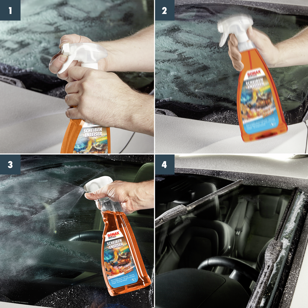 • Auf die enteiste Scheibe nochmals dünn ScheibenEnteiser aufnebeln.