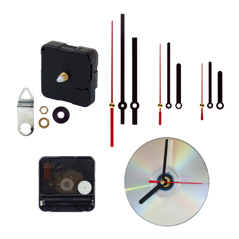 Qualitäts-Quarz-Uhrwerk mit 3 verschiedenen Zeiger-Sets: 3 Zeiger-Varianten (3 Sekunden-, 3 Minuten- und 3 Stundenzeiger), Stunden- und Minutenzeiger in schwarz, Sekundenzeiger rot.